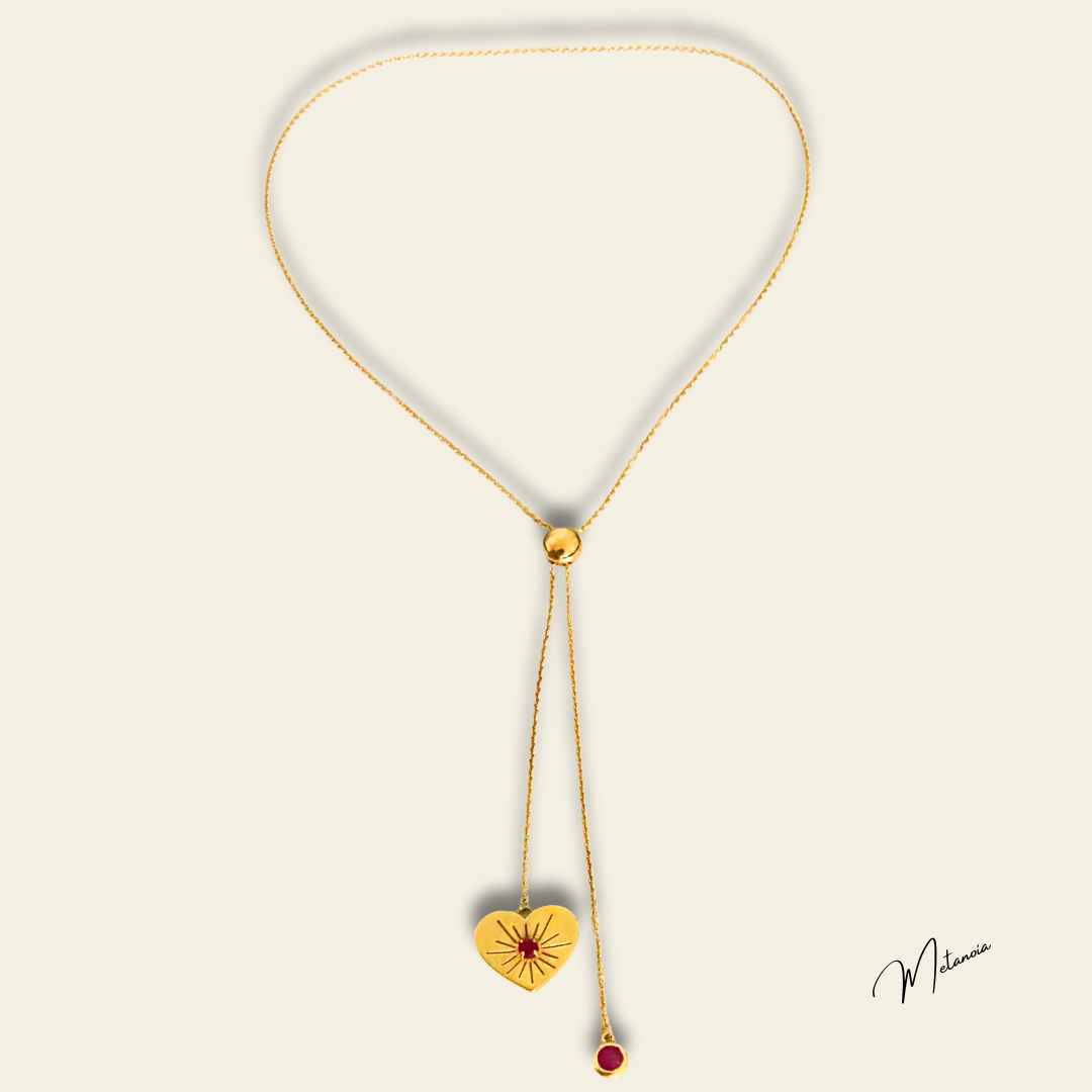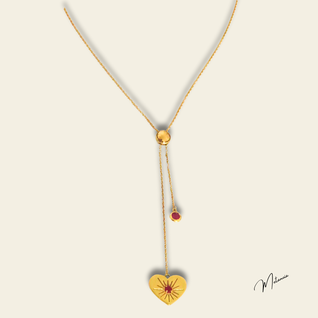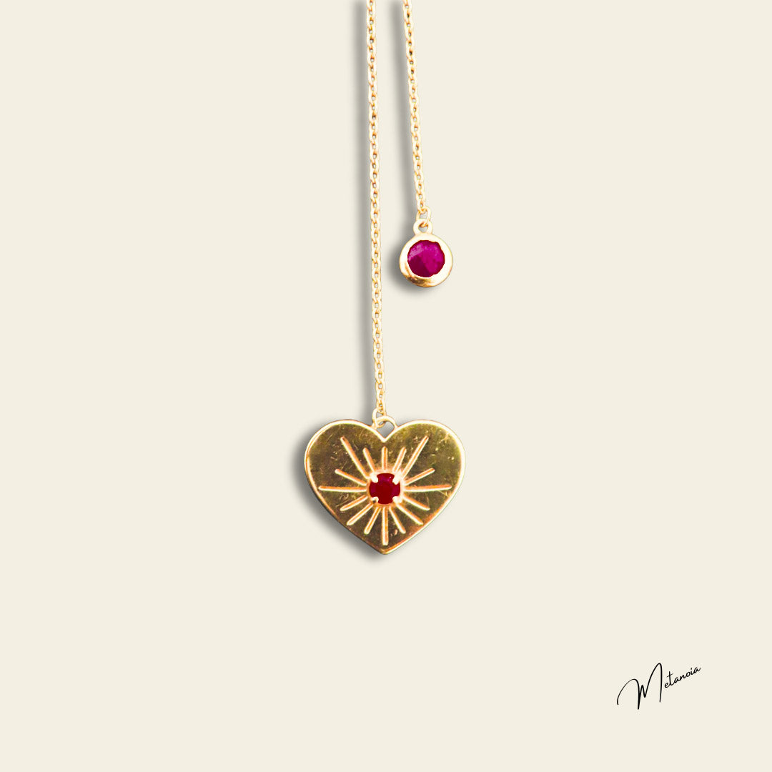 مرصع بأحجار ياقوت طبيعية، يتألق بلونه الأحمر العميق الذي يرمز إلى الحب والشغف والحيوية. ولكل حجر ياقوت طبيعته الخاصة من حيث اللون والصفاء والتكوين، مما يجعل كل قطعة فريدة من نوعها لا تتكرر.