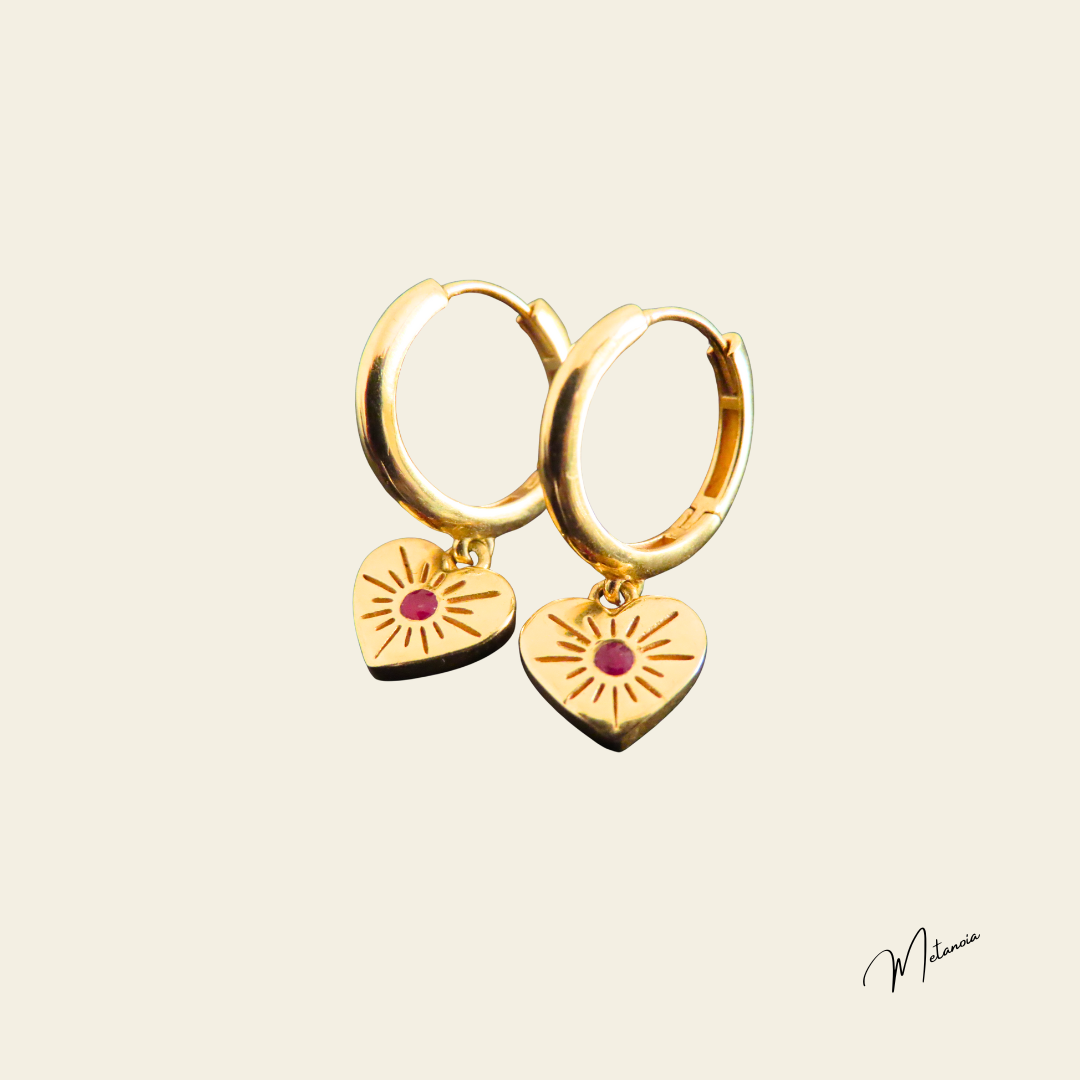 مصنوع يدوياً من فضة استرليني عيار 925 ومطلي بطبقة فاخرة من الذهب عيار 14 بسمك 2.5 ميكرون، مع حماية ضد بهتان اللون. يمنحه التشطيب اللامع مزيدًا من الجاذبية، بينما تضيف لمسات حجر الياقوت روح من الشغف والرقي.