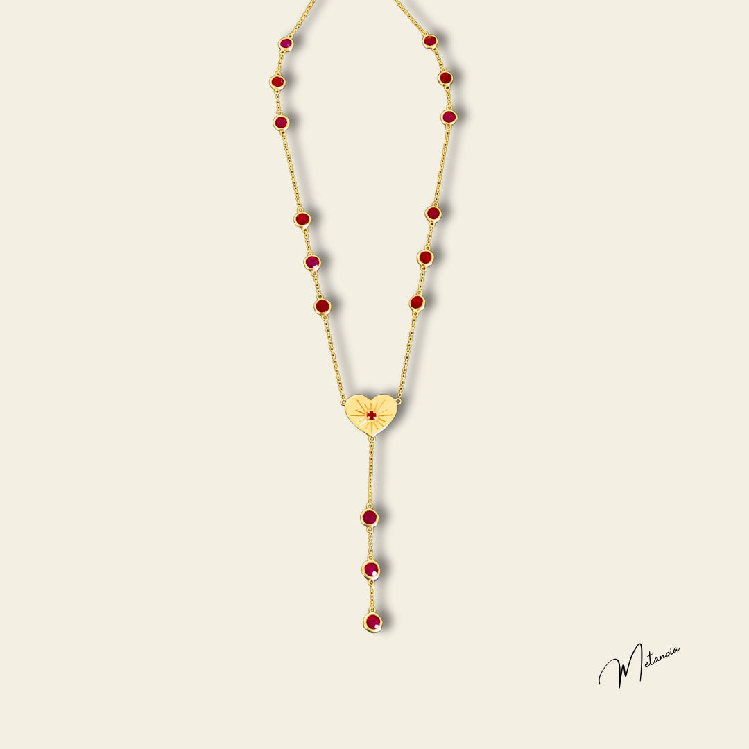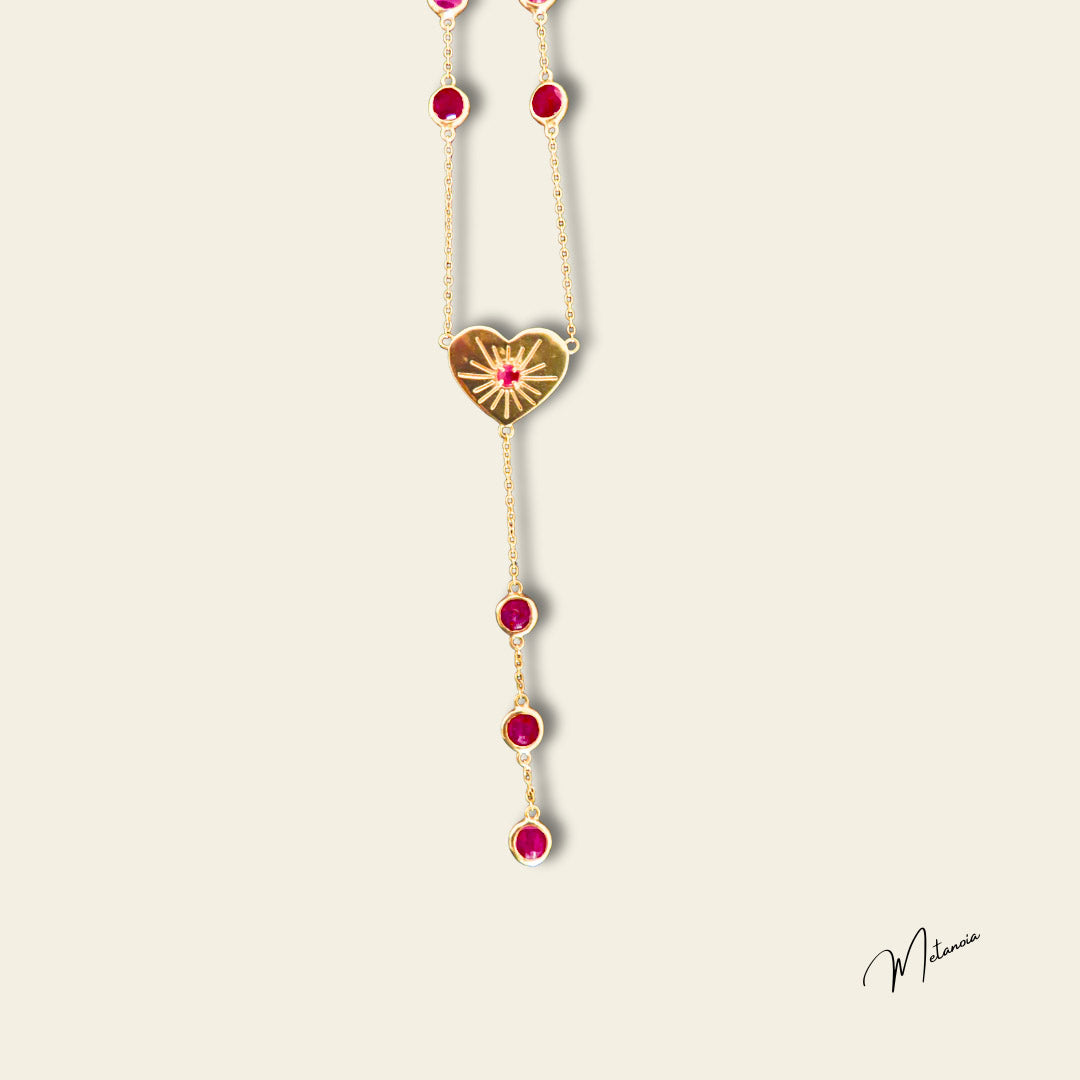 مرصع بأحجار ياقوت طبيعية مستديرة بقطر 3 مم، يتألق بلونه الأحمر العميق الذي يرمز إلى الحب والشغف والحيوية. ولكل حجر ياقوت طبيعته الخاصة من حيث اللون والصفاء والتكوين، مما يجعل كل قطعة فريدة من نوعها لا تتكرر.